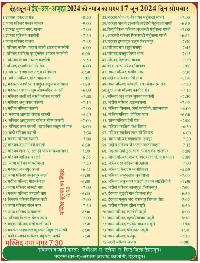 देहरादून में ईद-उल-अजहा (बकरीद) की नमाज चकराता रोड स्थित ईदगाह में सुबह 8ः30 बजे अदा की जाएगी। देहरादून में सबसे पहले गुप्ता कालोनी स्थित रहमत मस्जिद में सुबह 5ः50 बजे और सबसे बाद में जामा मस्जिद पल्टन बाजार में सुबह नौ बजे नमाज अदा की जाएगी।