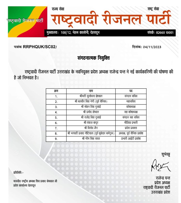 देहरादून। Rastrwadi Regional Party announces state executive राष्ट्रवादी रीजनल पार्टी के उत्तराखंड प्रदेश अध्यक्ष राजेंद्र पंत ने पार्टी के संगठन सचिव और कोषाध्यक्ष सहित 09 पदाधिकारियों को अपनी कार्यकारिणी में स्थान दिया है।