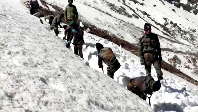 हेमकुंड साहिब मार्ग से बर्फ हटाते सेना के जवान।
